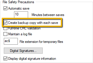 - Automatic save files—commonly referred to as "autosave" files—are backup files created automatically by the Autosave feature. Automatic save is enabled by default for every 10 minutes. The number of minutes between automatic saves can be set in the Open and Save tab in the Options dialog box, tab "Open and Save", or by using the SAVETIME system variable.